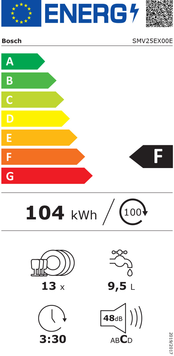 Blagovna znamka BOSCH VRSTA POMIVALNEGA STROJA VGRADNI ŠTEVILO POGRINJKOV 13 PORABA ENERGIJE NA 100 CIKLOV 104 KWH ŠTEVILO PROGRAMOV 5 ŠIRINA 59,8 CM PORABA VODE NA CIKEL 9,5 L VIŠINA 81,5 CM GLOBINA 55,0 CM ZAŠČITA PRED IZLIVOM VODE AQUA STOP Z GARANCIJO INVERTER MOTOR DA POVEZLJIVOST WI-FI NE ŠTEVILO TEMPERATUR 4 ZAMIK VKLOPA DA TRAJANJE PROGRAMA ECO 3:30 H : MIN ENERGIJSKI RAZRED F ŠIRINA POMIVALNEGA STROJA 60 CM EMISIJA HRUPA 48 DB RAZRED EMISIJE HRUPA C GARANCIJA V LETIH 2 LETI -