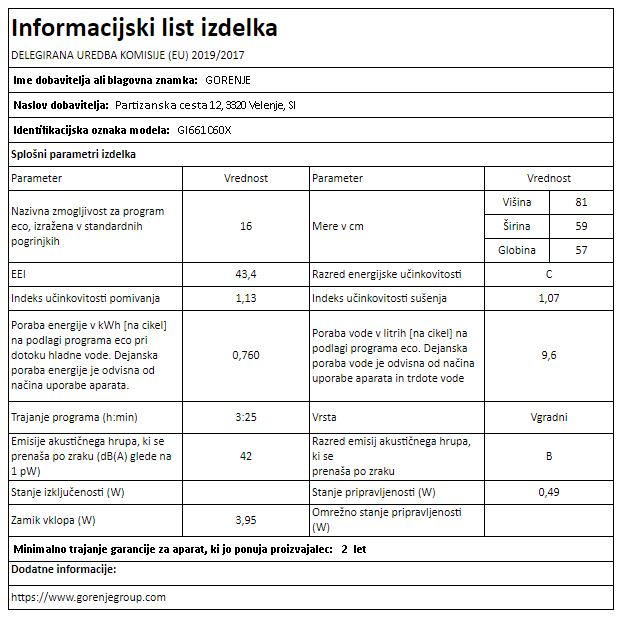 Blagovna znamka GORENJE VRSTA POMIVALNEGA STROJA VGRADNI ŠTEVILO POGRINJKOV 16 ŠIRINA 59,6 CM PORABA ENERGIJE NA 100 CIKLOV 76 KWH VIŠINA 81,7 CM ŠTEVILO PROGRAMOV 5 GLOBINA 55 CM PORABA VODE NA CIKEL 9,6 L ZAŠČITA PRED IZLIVOM VODE AQUA STOP INVERTER MOTOR DA ZAMIK VKLOPA DA ŠTEVILO TEMPERATUR 5 POVEZLJIVOST WI-FI NE ENERGIJSKI RAZRED C TRAJANJE PROGRAMA ECO 205 H : MIN ŠIRINA POMIVALNEGA STROJA 60 CM EMISIJA HRUPA 42 DB RAZRED EMISIJE HRUPA B GARANCIJA V LETIH 5 LET - Mnenja