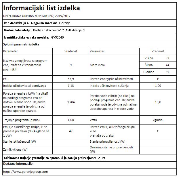 Blagovna znamka GORENJE VRSTA POMIVALNEGA STROJA VGRADNI ŠTEVILO POGRINJKOV 9 ŠIRINA 44,8 CM PORABA ENERGIJE NA 100 CIKLOV 70 KWH VIŠINA 81,5 CM ŠTEVILO PROGRAMOV 5 GLOBINA 55,8 CM PORABA VODE NA CIKEL 10 L ZAŠČITA PRED IZLIVOM VODE AQUA STOP INVERTER MOTOR NE ZAMIK VKLOPA DA ŠTEVILO TEMPERATUR 4 POVEZLJIVOST WI-FI NE ENERGIJSKI RAZRED E TRAJANJE PROGRAMA ECO 190 H : MIN ŠIRINA POMIVALNEGA STROJA 45 CM EMISIJA HRUPA 47 DB RAZRED EMISIJE HRUPA C GARANCIJA V LETIH 5 LET - Mnenja