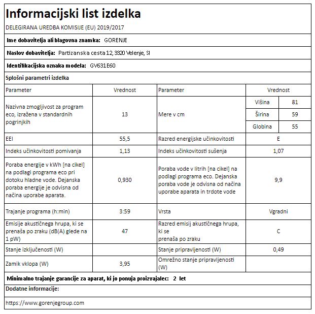 VGRADNI POMIVALNI STROJ GORENJE GV631E60