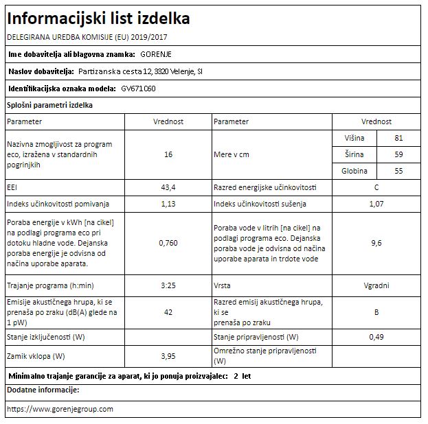 VGRADNI POMIVALNI STROJ GORENJE GV671C60