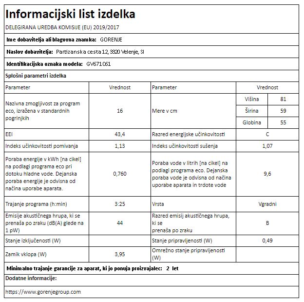 VGRADNI POMIVALNI STROJ GORENJE GV671C61