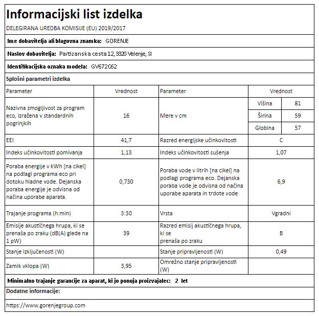 VGRADNI POMIVALNI STROJ GORENJE GV672C62