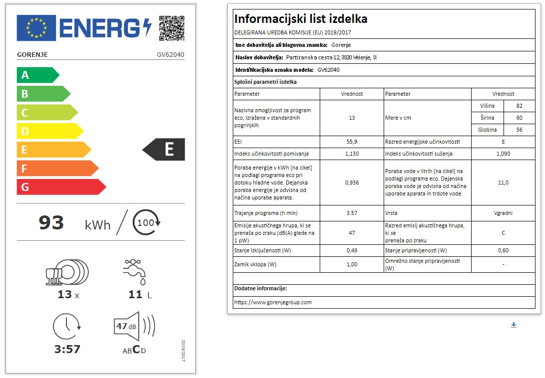 Blagovna znamka GORENJE ENERGIJSKI RAZRED E VRSTA POMIVALNEGA STROJA VGRADNI ŠTEVILO POGRINJKOV 13 PORABA ENERGIJE NA 100 CIKLOV 93 KWH ŠTEVILO PROGRAMOV 5 PORABA VODE NA CIKEL 11 L ŠIRINA 59,6 CM ZAŠČITA PRED IZLIVOM VODE AQUA STOP GLOBINA 55,8 CM INVERTER MOTOR NE ŠTEVILO TEMPERATUR 3 TRAJANJE PROGRAMA ECO 3:57 H : MIN ŠIRINA POMIVALNEGA STROJA 60 CM EMISIJA HRUPA 47 DB RAZRED EMISIJE HRUPA C ZAMIK VKLOPA DA POVEZLJIVOST WI-FI NE VIŠINA 81,5 CM GARANCIJA V LETIH 5 LET Mnenja