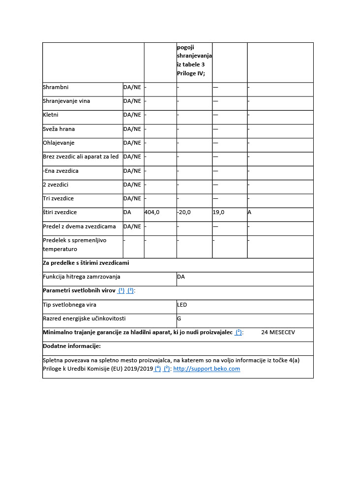 Blagovna znamka BEKO ENERGIJSKI RAZRED D VRSTA ZAMRZOVALNEGA APARATA PROSTOSTOJEČA OMARA PROSTORNINA ZAMRZOVALNI DEL 404 L LETNA PORABA ELEKTRIČNE ENERG. 233 KWH SAMODEJNO ODTAJEVANJE-NO FROST DA ZMOGLJIVOST ZAMRZOVANJA 20 KG/24 H ŠIRINA 70 CM SHRANJEVALNI ČAS OB MOTNJAH 17 H GLOBINA 76,8 CM INVERTER MOTOR DA BARVA BELA KLIMATSKI RAZRED SN-T: +10 DO +43°C EMISIJA HRUPA 38 DB RAZRED EMISIJE HRUPA C POVEZLJIVOST WI-FI NE VIŠINA 191,2 CM GARANCIJA V LETIH 2 LETI Mnenja