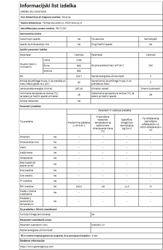 Blagovna znamka GORENJE ENERGIJSKI RAZRED F VRSTA ZAMRZOVALNEGA APARATA PROSTOSTOJEČA OMARA PROSTORNINA ZAMRZOVALNI DEL 242 L LETNA PORABA ELEKTRIČNE ENERG. 267,18 KWH SAMODEJNO ODTAJEVANJE-NO FROST NE ZMOGLJIVOST ZAMRZOVANJA 14 KG/24 H ŠIRINA 60 CM SHRANJEVALNI ČAS OB MOTNJAH 18 H GLOBINA 60 CM INVERTER MOTOR NE BARVA BELA KLIMATSKI RAZRED N: +16 DO +32°C ST: +18 DO +38°C EMISIJA HRUPA 40 DB RAZRED EMISIJE HRUPA C POVEZLJIVOST WI-FI NE VIŠINA 170 CM GARANCIJA V LETIH 5 LET Mnenja