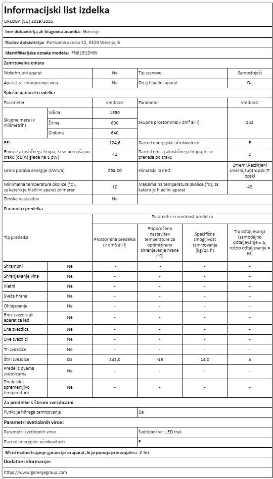 Blagovna znamka GORENJE ENERGIJSKI RAZRED F VRSTA ZAMRZOVALNEGA APARATA PROSTOSTOJEČA OMARA UPRAVLJANJE ELEKTRONSKO PROSTORNINA ZAMRZOVALNI DEL 243 L LETNA PORABA ELEKTRIČNE ENERG. 294 KWH SAMODEJNO ODTAJEVANJE-NO FROST DA ZMOGLJIVOST ZAMRZOVANJA 18 KG/24 H ŠIRINA 60 CM SHRANJEVALNI ČAS OB MOTNJAH 15 H GLOBINA 64 CM INVERTER MOTOR NE BARVA BELA KLIMATSKI RAZRED SN-T: +10 DO +43°C EMISIJA HRUPA 42 DB RAZRED EMISIJE HRUPA D POVEZLJIVOST WI-FI NE VIŠINA 185 CM GARANCIJA V LETIH 5 LET Mnenja