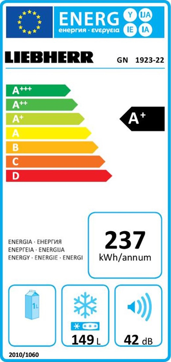 Blagovna znamka LIEBHERR VRSTA ZAMRZOVALNEGA APARATA PROSTOSTOJEČA OMARA PROSTORNINA ZAMRZOVALNI DEL 149 L LETNA PORABA ELEKTRIČNE ENERG. 237 KWH ŠIRINA 60 CM SAMODEJNO ODTAJEVANJE-NO FROST DA VIŠINA 125 CM ZMOGLJIVOST ZAMRZOVANJA 15 KG/24 H GLOBINA 63 CM SHRANJEVALNI ČAS OB MOTNJAH 14 H BARVA BELA GLASNOST DELOVANJA 42 DB INVERTER MOTOR NE ENERGIJSKI RAZRED A+ KLIMATSKI RAZRED SN-T: +10 DO +43°C GARANCIJA V LETIH 5 LET -
