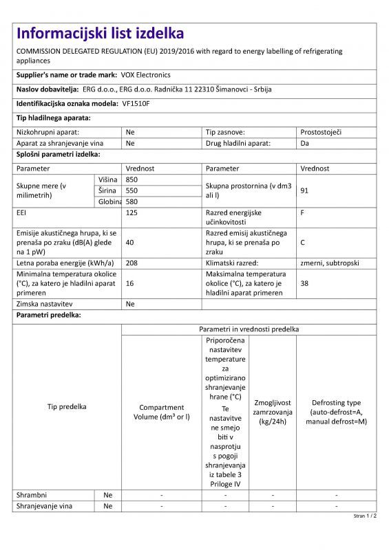 Prostostoječi vertikalni zamrzovalnik Vox VF 1510 F spada v energijski razred F. Letno porabi 208 kWh energije, med delovanjem pa proizvede 40 dB hrupa. Prostornina zamrzovalnika znaša 91 litrov.