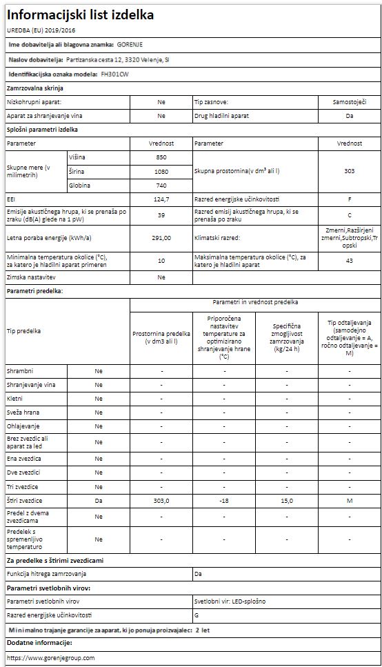 ZAMRZOVALNA SKRINJA GORENJE FH301CW