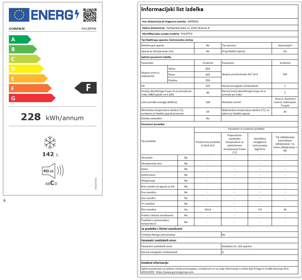 Blagovna znamka GORENJE VRSTA ZAMRZOVALNEGA APARATA SKRINJA BARVA BELA ŠIRINA 62,5 CM PROSTORNINA ZAMRZOVALNI DEL 142 L VIŠINA 85,4 CM LETNA PORABA ELEKTRIČNE ENERG. 228 KWH GLOBINA 55,9 CM ZMOGLJIVOST ZAMRZOVANJA 7 KG/24 H SHRANJEVALNI ČAS OB MOTNJAH 16 H INVERTER MOTOR NE POVEZLJIVOST WI-FI NE ENERGIJSKI RAZRED F KLIMATSKI RAZRED N: +16 DO +32°C T: +18 DO +43°C EMISIJA HRUPA 40 DB RAZRED EMISIJE HRUPA C GARANCIJA V LETIH 5 LET - Mnenja